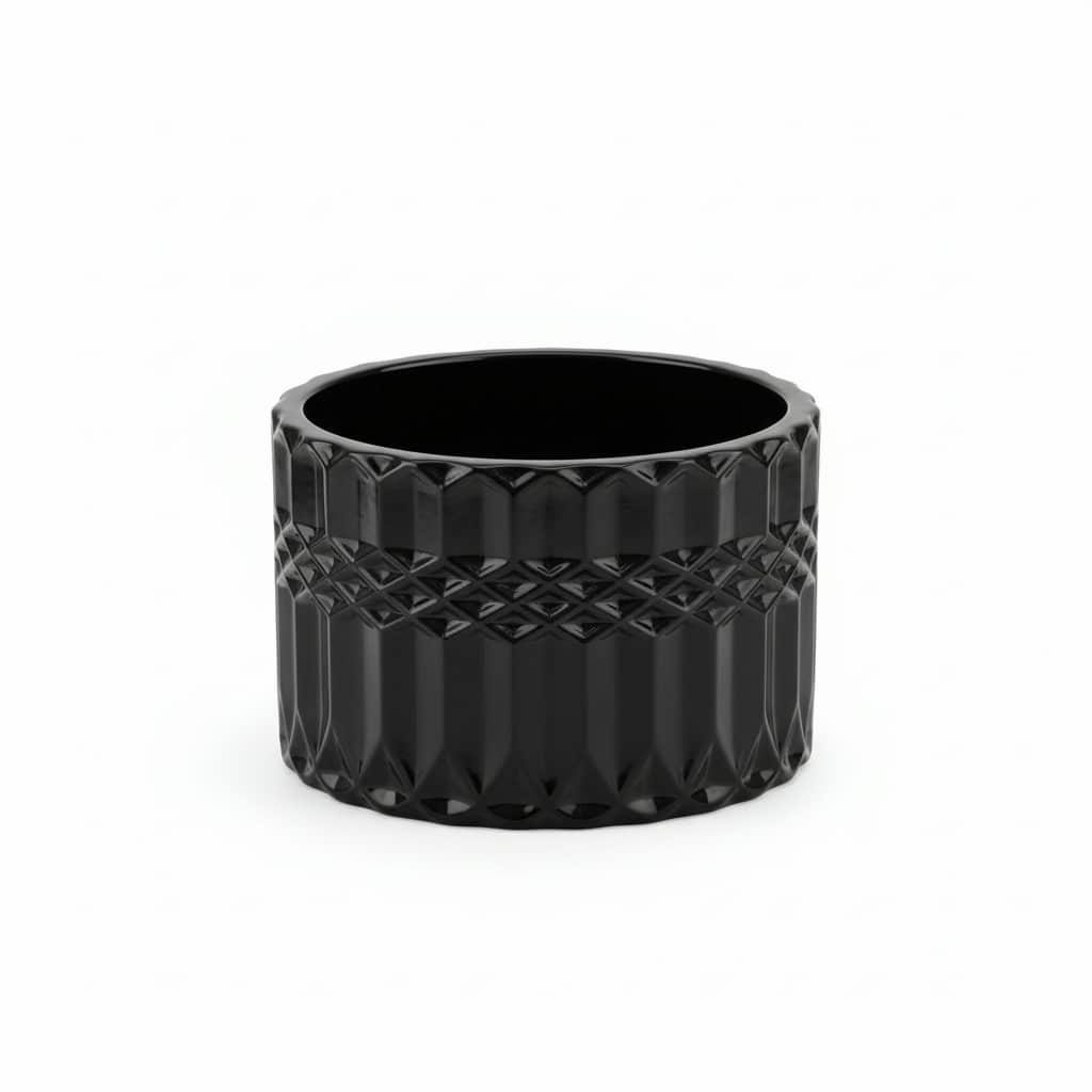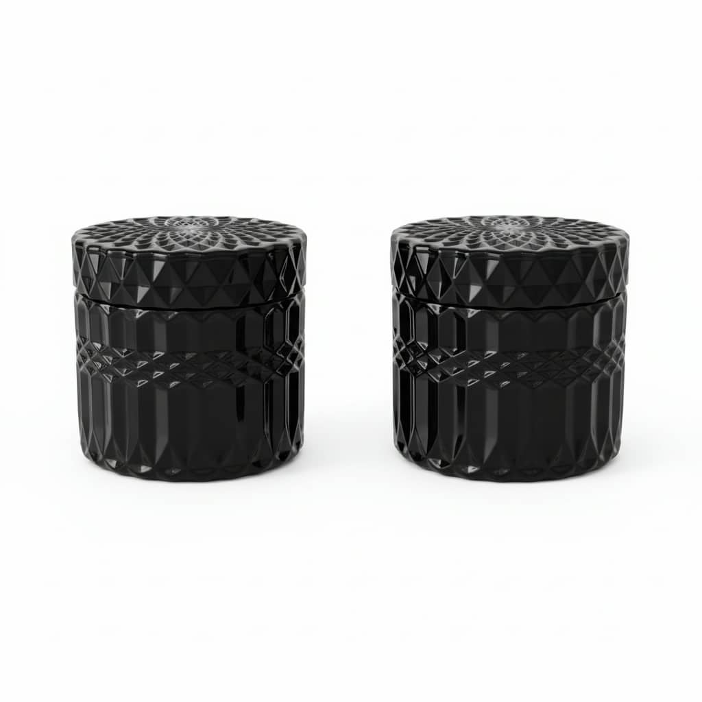The precisely cut cut-glass pattern subtly reflects light, while the deep black tone allows labels, logos, and metallic accents to stand out beautifully. The solid lid adds both practicality and refinement — a perfect choice for gifts and professional candle lines alike.