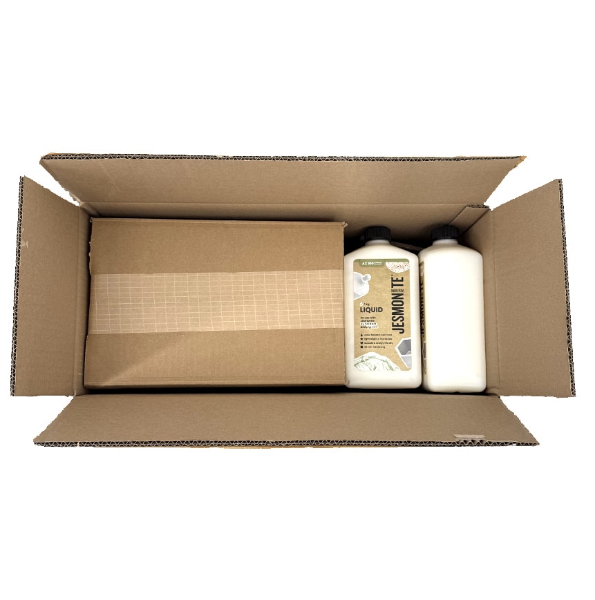 The Jesmonite AC100 kit includes 7 kg of Jesmonite AC100 liquid and 17,5 kg of Jesmonite AC100 base, mixed at the precisely recommended 2.5:1 ratio by weight.