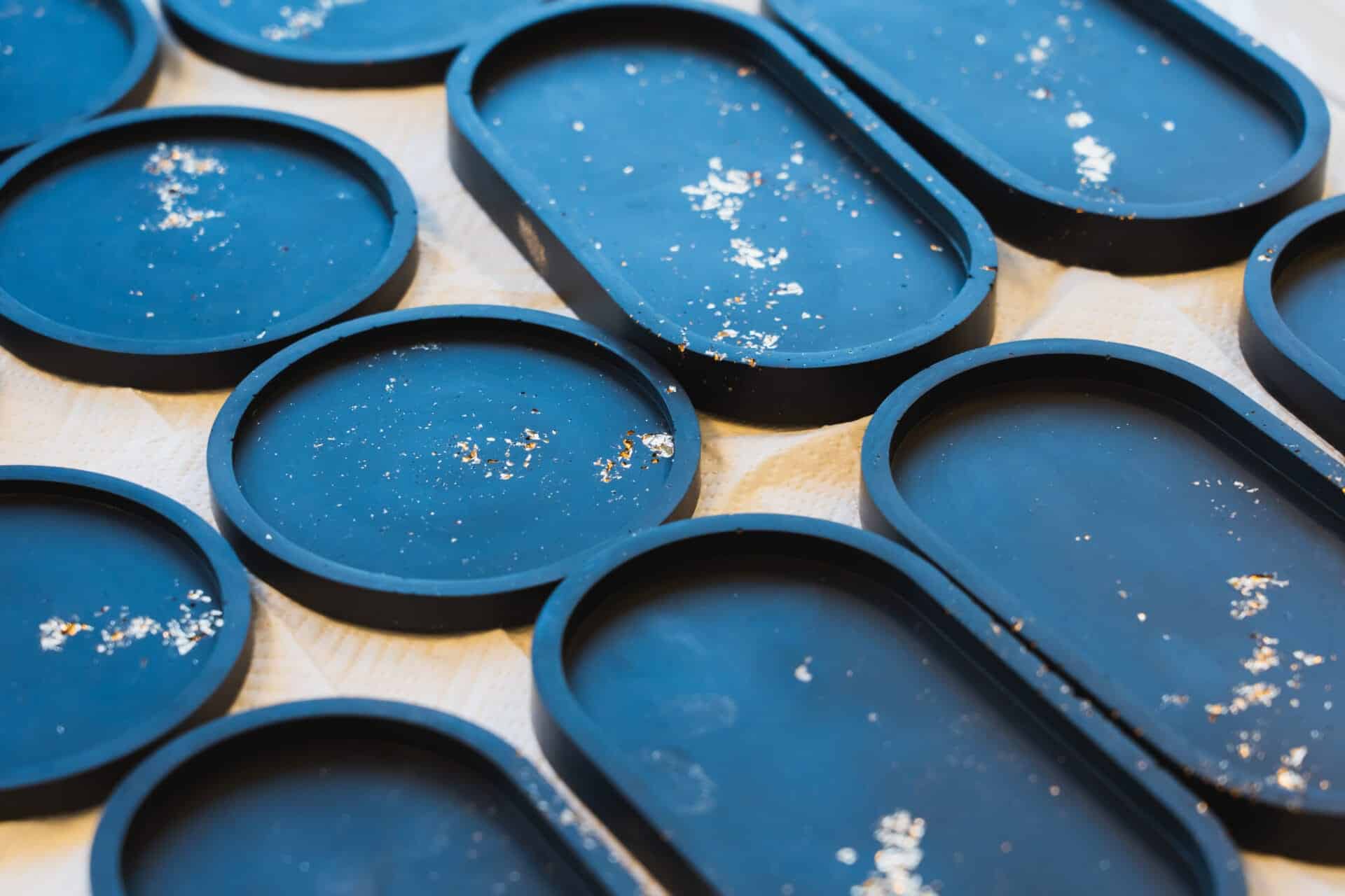 Add flakes to the dry mould before pouring Jesmonite – they will remain on the surface, creating a subtle shimmering effect.